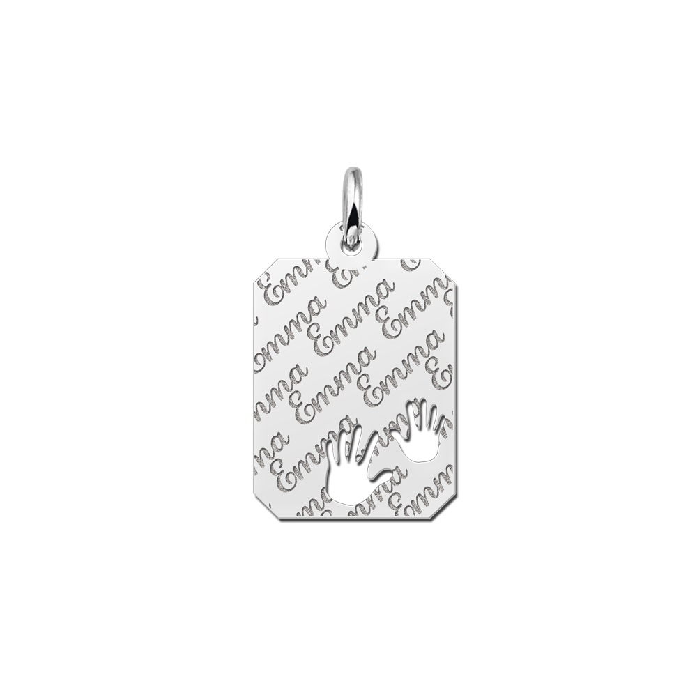 This Sterling Silver 14 x 18 mm rectangle charm namependant with 2 tiny hands will be individually engraved with the name of your choice. Don't forget to order a matching chain with this mini tag pendant.